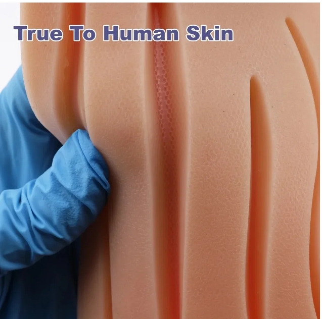 ทำจากซิลิโคนเกรดอาหาร,ไม่มีกลิ่น,ปลอดสารพิษ,เป็นมิตรกับสิ่งแวดล้อม,สามารถที่จะวงจรการใช้งานและแบบพกพา,ทำให้เย็บการฝึกอบรมง่ายขึ้นและมีความสุขเนื้อแผ่นเย็บใกล้เคียงกับผิวจริงไม่ใช่แค่ยางแข็งเท่านั้น