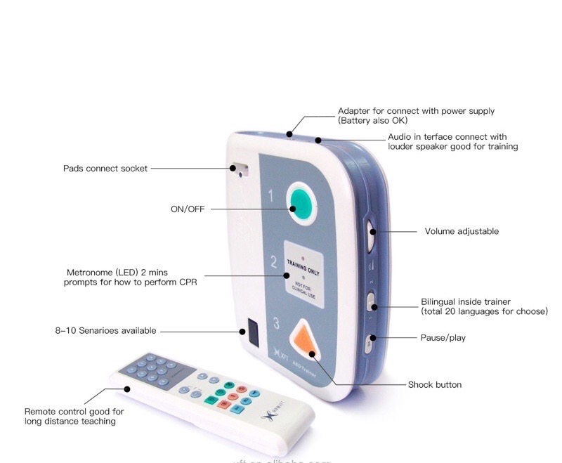 10.มี Remote Control ที่สามารถสั่งการทำงานของเครื่อง ครอบคลุมถึง 3-5 เมตร (10-15ฟุต) ทำให้ผู้เรียนสามารถทำตามขั้นตอน ต่างๆได้อย่างมั่นใจ พร้อมทั้งสถานะการณ์จำลอง ได้ทั้งหมด 10 รูปแบบตามมาตรฐาน AHA และ ERC กำหนดไว้ได้อย่างลงตัว